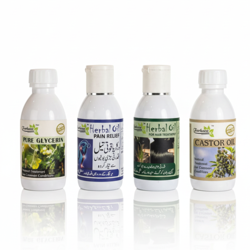 Herbal Oil for Hair Treatment (100ml): A specialized herbal blend (قُدرتی جڑی بوٹیوں) formulated to nourish the scalp, reduce hair fall, and promote healthy, lustrous growth.